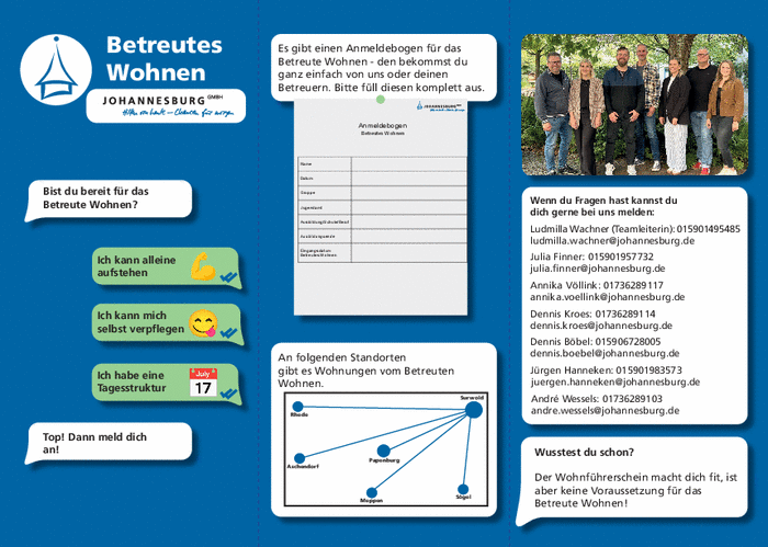 Das betreute Wohnen der Johannesburg ist ein Hilfeangebot an Jugendliche, junge Volljährige und unbegleitete (minderjährige) Flüchtlinge ab dem 18. Lebensjahr; in Einzelfällen auch jünger. Die jungen Menschen werden unterstützt und dabei begleitet, den Weg in ein eigenständiges Leben zu finden. Vor allem bei einem Übergang aus der vollstationären Erziehungshilfe in ein eigenständiges Leben, bietet das betreute Wohnen sinnvolle und notwendige Hilfestellung an.